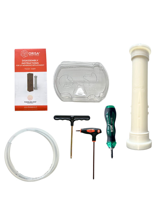 Membrane d'ultrafiltration, outils, graisse silicone, brosse préfiltre, entretenez votre purificateur d'eau ORISA® afin de prolonger sa durée de vie.