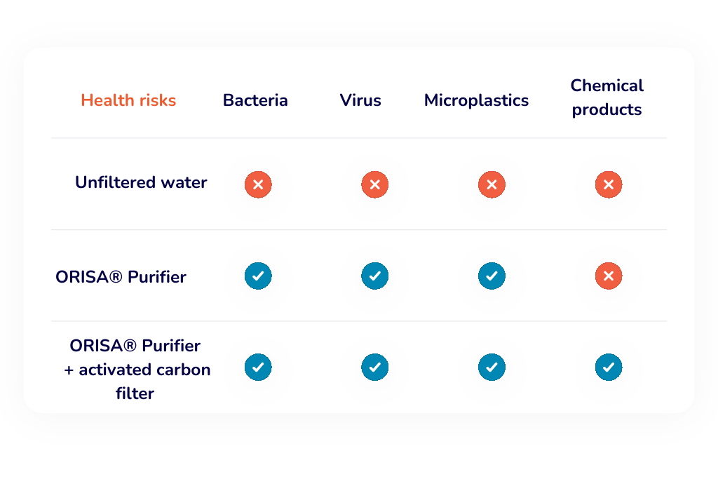 See the testsEffectiveness tested by the Pasteur Institute, which states that ORISA® filters freshwater optimally: biological contamination eliminated and water filtered of all suspended matter. Viruses: +99.999% (LOG 5), Bacteria and protozoa: +99.999999% (LOG 8)