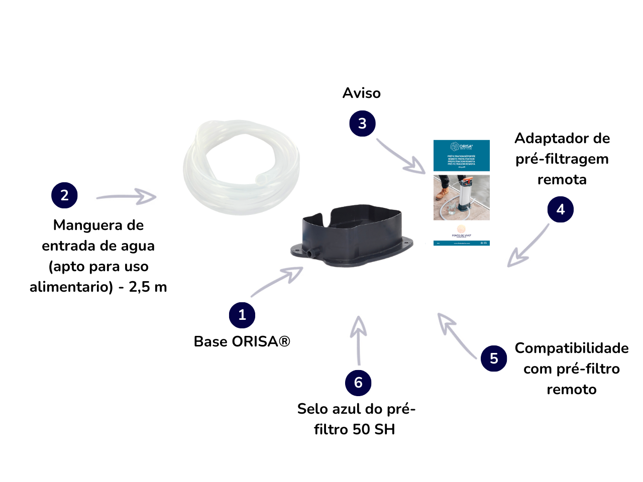 La prefiltración remota ORISA® permite a los usuarios recolectar agua cerca sin sumergir el purificador en la fuente de agua. El agua a filtrar se aspira de forma remota y se puede realizar desde diferentes fuentes hídricas: un cuerpo de agua, una fuente de difícil acceso o una reserva de agua.
