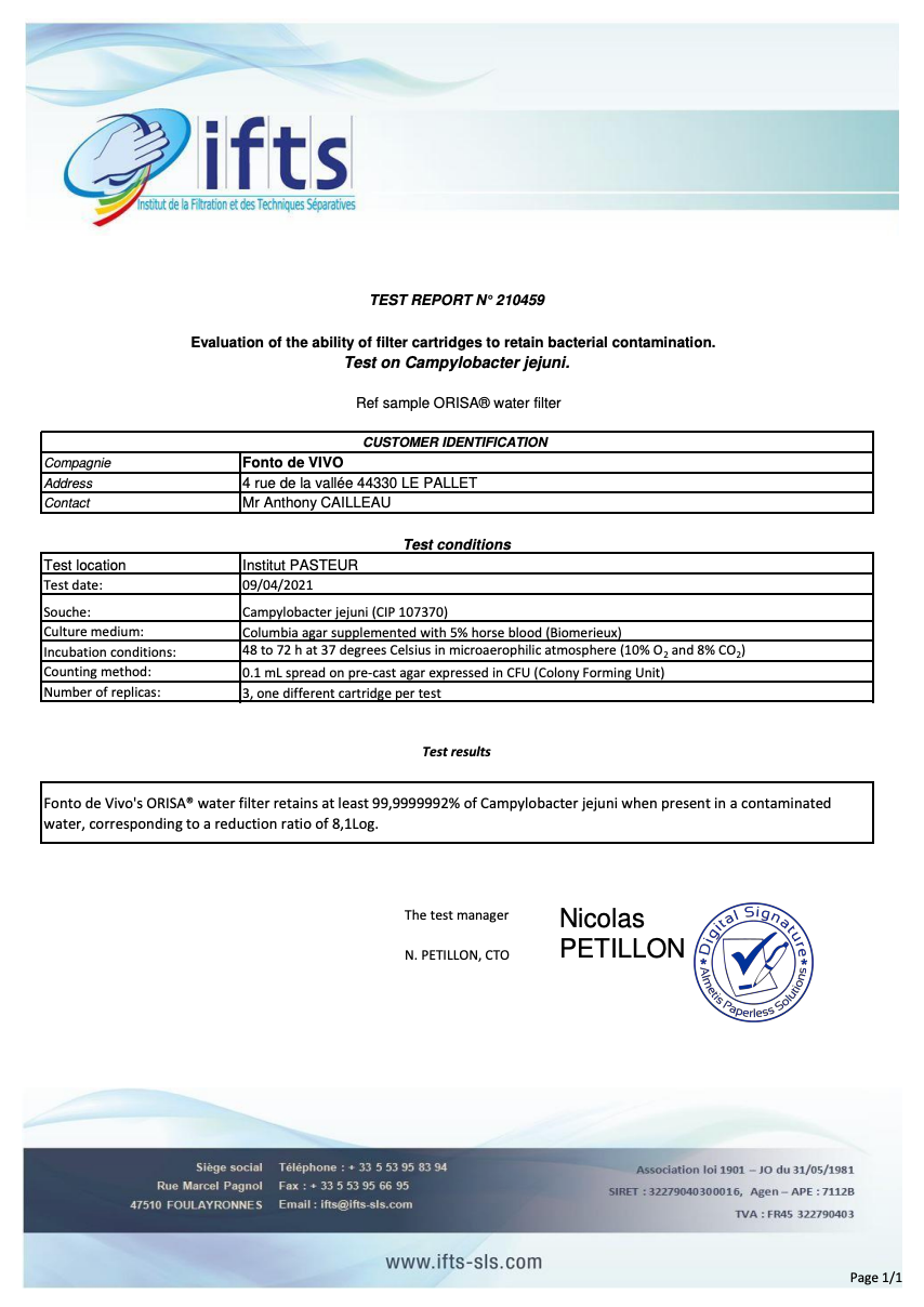 Le purificateur d'eau ORISA® a été testé sur une bactérie particulièrement exigeante : Campylobacter jejuni. Les résultats montrent une élimination supérieure à 99,9999992 %, soit plus de 8 LOG de réduction.