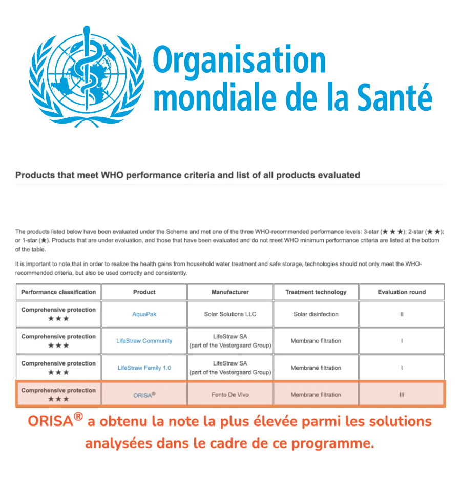Graças a esta perfeita adaptabilidade, ORISA® obteve o nível de desempenho “Proteção completa: três estrelas” no âmbito do programa de avaliação internacional de tecnologias de tratamento de águas domésticas (HWTS round III) da Organização Mundial da Saúde (OMS).