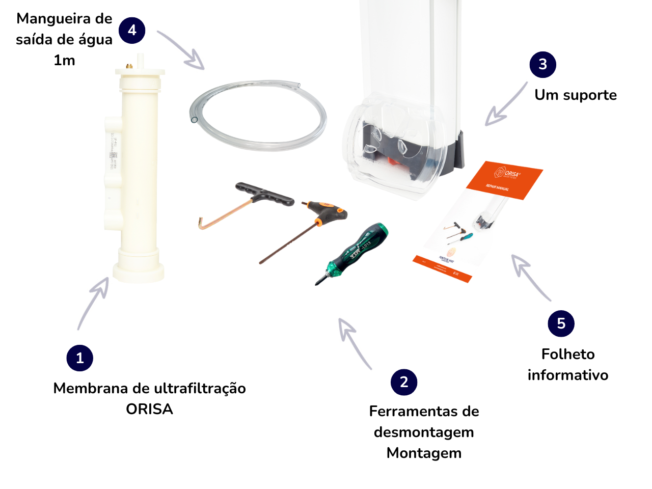 O kit de manutenção da membrana de ultrafiltração do purificador ORISA® permite trocar o sistema de tratamento de água utilizando uma nova membrana e as ferramentas específicas ORISA® necessárias para a desmontagem e remontagem do filtro.