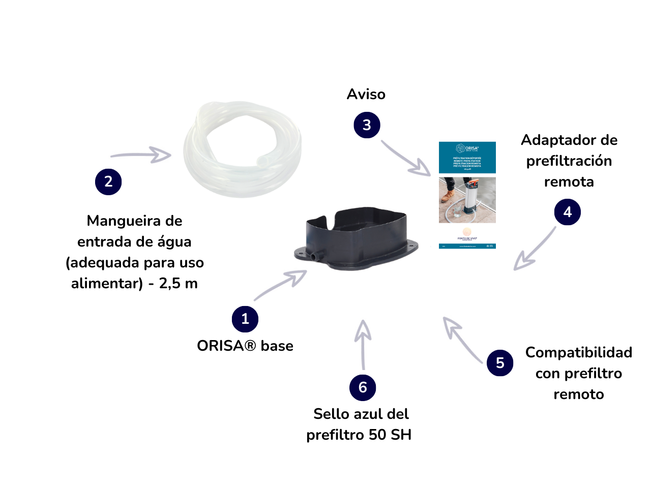 A pré-filtração remota ORISA® permite aos usuários coletar água nas proximidades sem mergulhar o purificador na fonte de água. A água a ser filtrada é aspirada remotamente e pode ser feita de diferentes fontes hídricas: um corpo d’água, uma fonte de difícil acesso ou uma reserva hídrica.